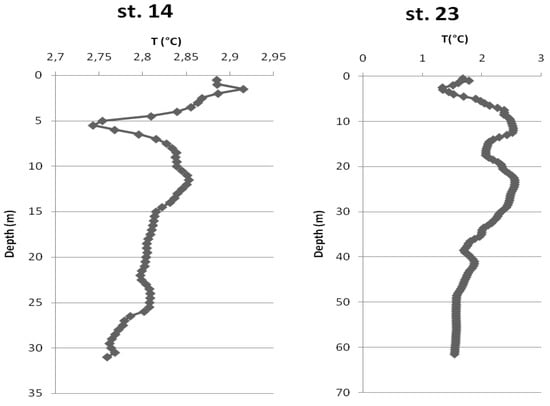 The temperature profiles showed a detectable signal of colder water that moved away from the glacier toward the bottom, as observed along the vertical profiles of the stations 14 and 23, at the depth of 5 and 3.5 m respectively (Figure 3).