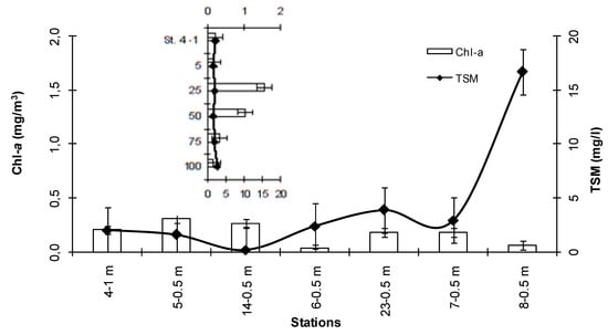 Mean values ± S.E. of Chl-a and TSM concentrations measured along the Kongsfjorden transect, from the entrance to the glacier, and vertical profile of the station 4 (0–100 m).