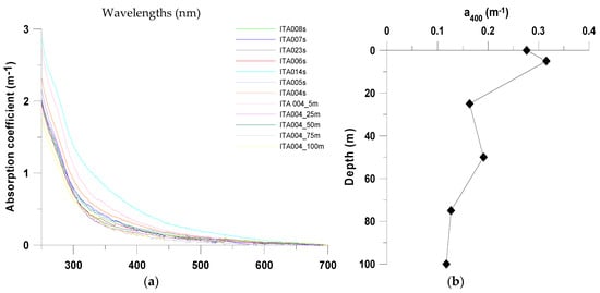 CDOM absorption spectra (Figure 5a) showed a classical unstructured shape with the near exponential decrease at increasing wavelengths (from the ultraviolet to the visible region). Values at 400 nm varied from 0.1175 (st. 4, 100 m) to 0.4905 (st. 14). At st.4, a first (sub)surface peak linked to terrestrial inputs was followed by a less pronounced peak (50 m), related to in situ marine production processes, laying just below the peak of Chl-a detected at 25 m (Figure 5b). CDOM absorption slope values (S275–295) varied from 0.0077 to 0.0109 nm−1, indicating the occurrence of molecules with high molecular weight and aromaticity degree, typical of waters influenced by the presence of terrestrial inputs [31]. In particular, the lowest value was observed at the st.14, in correspondence of the detected colder water from the glacier melting and the highest CDOM absorption values.