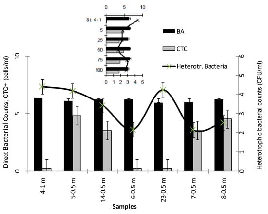 Direct bacterial cell counts (BA) and the fraction of actively respiring cells (CTC) were in the magnitude order of 106 and 104 cells/mL, respectively. Minimum and maximum abundance of BA and CTC+ were recorded at stations-23 and 4–75 m, respectively (Figure 6). CTC counts accounted for percentages of 0–5.39% of total BA. Cultivable heterotrophic bacteria were in the order of 103 CFU/mL. They showed the lowest abundance at st. 4–50 m, the highest one at the same station at surface layer; overall, they represented 0.002–2.11% of total BA.