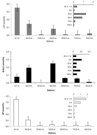 Enzymatic activity patterns were in the magnitude order AP > LAP > GLU, with rates lower than 1.78, 1.25, and 0.25 nmol/L/h, respectively. At st. 4, AP prevailed at the surface, enabling the recycling of phosphorous for primary production, while LAP and GLU were more active at intermediate depths (Figure 7).