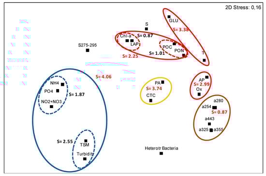 Multidimensional scaling (MDS) analysis of environmental and microbiological variables; the similarity (S) level among the variables is indicated.