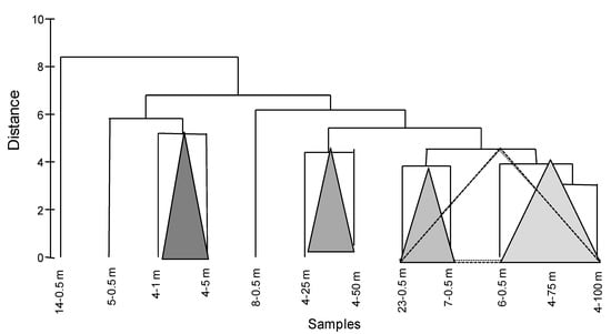 Both biochemical and optical parameters individuated different sub-areas, having terrestrial or marine properties. Within st. 4, cluster analysis discriminated the surface layers, including the water samples up to a 5 m depth and associated to st. 5 by an Euclidean distance of 5.14, from the deepest ones (75 and 100 m), associated to st. 6 with an Euclidean distance of 4.05. This last-subcluster was similar to another one (that included st. 23 and st. 7 with an Euclidean distance of 3.85) and both the clusters grouped together with an Euclidean distance of 4.35 (Figure 9). Samples 4–25 m and 4–50 m, characterized by high phytoplankton biomass, clustered together (Euclidean distance of 4.15), while st.14–0 m remained unclustered.