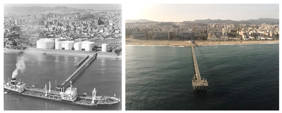1980s (left) and 2017 (right) aerial photos of the Pont del Petroli. Originally constructed for industrial purposes, the pier is now open to the public. (Sources: Concepció Riba).