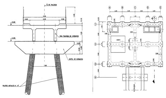 Geometrical details and top view of the platform, beam and pile cap forming the Pont del Petroli pier. The sketches are extracted from the first design report and provided by the Maritime Engineering Laboratory of Universitat Politècnica de Catalunya-BarcelonaTech (LIM/UPC) for the present manuscript. The sketches belong to the original project deposited in the 1965 archive "Colegio de Ingenieros de Caminos, Canales y Puertos de Madrid", PN 9280/65, under José Entrecanales Ibarra.