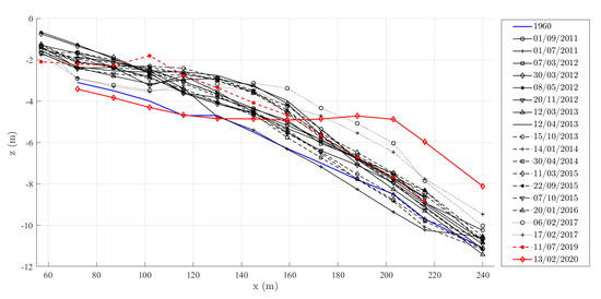 Sketches of each element are depicted in Figure 2. The piles below the pile caps present an inclination of 7.5 degrees with respect to the vertical direction. The piles are embedded about 6 m deep into the sandy bottom, as detected from the original design report. The main exposed area, the self-weight and the total distributed load for each element that forms the pier are reported in Table 1. All values are extracted from the original report on the structural design of the pier and have been checked carefully. The water depth and beach profile at the Pont del Petroli location changed significantly since its date of construction. Initially conceived with a water depth of 12 m at the deepest point (i.e., at the toe of the platform), the pier experienced radical changes related to both the water depth and bottom slope. LIM/UPC carried out 19 bathymetric surveys in the period between 2011 and 2020, the last one being carried out right after storm Gloria. Results from these surveys are shown in Figure 3, where the original profile from the design report is highlighted in blue while the profiles right before and after the passage of storm Gloria are indicated in red. The distance is measured from the land-side—the beginning of the footbridge. The platform toe is located at m. The most seaward footbridge beam and the platform are located between and m. The vertical axes express the distance from the mean water level, being positive if upwards. While for the rear part of the pier, from the fourth pile cap to the shoreline, the bottom slope did not show remarkable modifications and remained on average between 1:30 and 1:25, the front and most seaward part, from the fourth pile cap to the platform, showed the greatest change, especially in terms of the local water depth. The local sand accretion determined a reduction of the water depth from the initial 12 to almost 9 m. While an almost linear trend had been observed during the past years, a sudden change was surveyed after storm Gloria in early 2020. The measured water depth at the toe of the platform was observed to be 8 m, hence 4 m less than the design value.