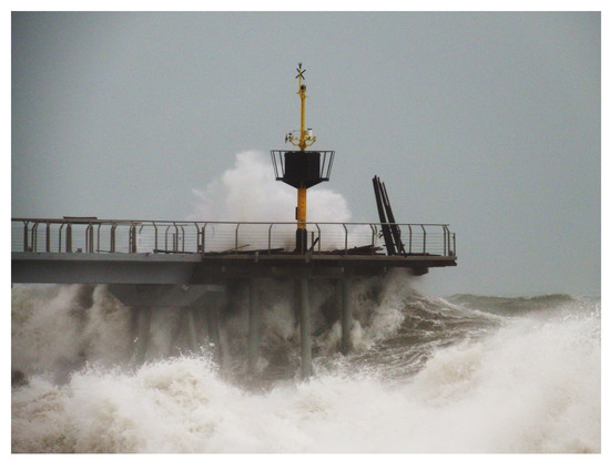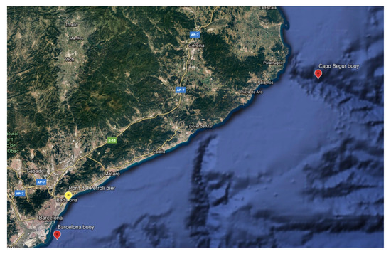 It is difficult to characterize the wave climate in the area surrounding the Pont del Petroli. The closest buoy to the pier is located at Puertos del Estado [30], located just outside the Barcelona harbor (Lat. 41.32 N, Long. 2.20 E), south of Badalona. However, the buoy stopped recording data during storm Gloria. The latest available data were recorded on 19 January 2020 at 21:54, Barcelona time: the maximum recorded wave height was 5.64 m. The most complete and available information to date on the characteristics of storm Gloria can be found in the readings by the buoy of Capo Begur (Lat. 41.90 N, Long. 3.66 E), several kilometers north-east of Badalona (Figure 4). At the same time that the Barcelona buoy stopped working, the maximum wave height recorded at by the Capo Begur buoy was 6.8 m, approximately half of the 13.8 storm peak occurred (and recorded) 1 day later. The significant wave height, , recorded at Capo Begur was higher than 6.0 m for 44 h, with a peak value of 7.8 m. The main wave and wind direction was east-northeast. Of all the recordings from the Capo Begur buoy in the period between 2001 and 2017, only a handful of them show wave heights close to or larger than 7.0 m, as the values recorded during storm Gloria: m from the north in 2003, m from north-east in 2010 and m from north-east in 2016. These values notwithstanding, there is no trace of extreme data similar to that of storm Gloria, especially in terms of the duration of the storm peak and the strong winds (greater than 70 km/h).