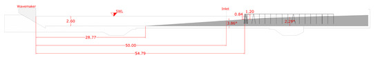 The numerical model was conceived of to prepare the experimental testing that will be carried out at LIM/UPC. Therefore, the design of the different simulations was done in a way to accurately mimic the experimental facility where the physical testing will be carried out. The experimental campaign will be executed in the large-scale wave flume CIEM at LIM/UPC. The flume is 100 m long and 3 m wide, and equipped with a wedge-type wavemaker. Tests will be carried out with an initial water depth of 2.6 m, measured close to the wavemaker location. The water depth was chosen as a compromise between the technical capabilities of the wavemaker and the model scale. The model of the Pont del Petroli pier will be reproduced at a geometrical scale of 1:10, based on the Froude similitude. A beach with 1:15 slope extends between m and m, being the position of the wavemaker at rest. The pier model will be placed starting from m, being this the location of the front platform. At this location, the local water depth is 0.84 m, corresponding to 8.4 m in the prototype, similar to the post-Gloria survey. The rear part of the foreshore consists of a 1:25 slope up to the back of flume. A sketch of the model layout is depicted in Figure 6. The pier will be built with all the original details, from the platform to the third beam that forms the footbridge, being this the part of the structure that was exposed to the waves impact. The piles will not be modeled to follow a conservative approach where the loading on the platform, footbridge and pile cap will be maximized, skipping the partial sheltering effect of the piles. The main focus of the numerical analysis is to measure the water load on the platform, the first pile cap and the first footbridge beam. These are the most seaward elements that experienced heavy damage during storm Gloria. The pier model will be equipped with load cells and pressure sensors during the experimental campaign. The numerical model will thus provide important and necessary information for the measurement design and setup of the instrumentation.