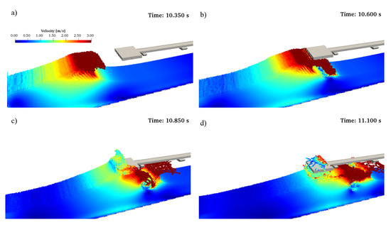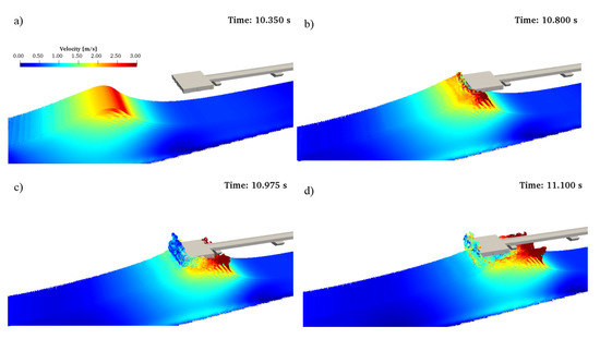 Four snapshots of the results from the simulation of test cases A1 and B1 are depicted in Figure 7 and Figure 8, respectively, corresponding to the impact of the first simulated wave on the pier. The colors represent the magnitude of horizontal velocity. The two test cases differ in the wave breaking process. In A1, the wave is still shoaling on the 1:15 (Figure 7a) when it bumps into the pier platform (Figure 7b). In B1, the wave starts to break before the structure. A characteristic plunging breaker profile can be identified in Figure 8a: the wave crest, characterized by very high velocities, is curling over and dropping onto the wave trough. During this process, the plunger encounters the pier platform where it is transferring most of its momentum (Figure 8b). Large splashes are produced as seen in Figure 8c, and part of the wave energy is finally transferred above the platform deck for wave overtopping (Figure 8d). The waves overtopping the platform are then falling onto the platform, exerting a downwards force on the platform deck. Wave overtopping can also be noted for case A1 (Figure 7c), though volumes are smaller than those in case B1.