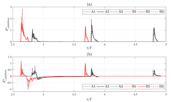 Time history of the normalized (a) horizontal and (b) vertical forces on the pier platform for different tested wave conditions.