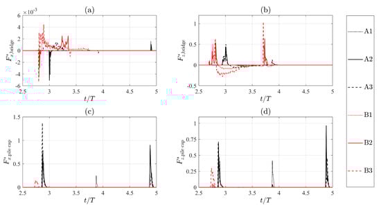 Time history of the normalized forces on the beam and pile cap for different tested wave conditions: (a) horizontal force on the pier beam, (b) vertical force on the pier beam, (c) horizontal force on the pile cap and (d) vertical force on the pile cap.