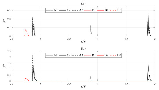 where is the vertical force measured on the pile cap and exerted by the wave action, is the weight of the pile cap and is the footbridge beam weight. The vertical load exerted by the waves is actually directed upwards, similarly to an uplifting force, whereas the weight of the structure is acting downwards, against the wave action. Finally, the action on the pile cap is expressed in terms of the normalized variables and , where is the horizontal force measured on the pile cap. Results are reported in Figure 11: the maximum value of is smaller than 0.3 for test case A2, whereas larger values with a maximum of are seen for test case A3. These results show that the ultimate lateral resistance is exceeded before the axial pile resistance. For test cases B1–B3, both and results lower than 1, in stead. Although the piles are not modeled directly in DualSPHysics, the action exerted by the waves on the piles was assessed. To this end, the modified Morison’s equation was employed [61], to take into account the slamming force due to the breaking waves: