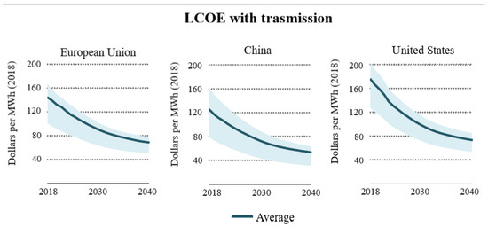 Levelized Cost Of Energy (LCOE) for new offshore wind projects in the European Union, China, and United States from 2018 to 2040, adapted from the work in [2].