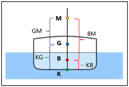 where is the distance from the metacenter to COB, also called metacentric radius, and it is given by Equation (5); is the distance from the keel to COB; and is the distance from the keel to the COG.