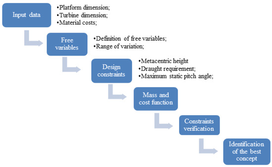 The first step of the process provides for the identification of free variables for each concept: it is about those quantities, such as platform radius, column height, and mass of ballast, which intrinsically characterize a structure. Furthermore, to avoid unfounded or out-of-scale solutions, the variation ranges are defined for each of them. Constraints and requirements, concerning stability and buoyancy of the FOWT system are imposed, in accord to actual standards. Finally, for each concept a mass and a cost function are defined. In particular, the cost function works as a fitness function for genetic algorithm: for each cycle, genetic algorithm provides to minimize the cost function in order to satisfy all the constraints. The process evolves until the value of the cost function no longer decreases, as a minimum value has been reached. This process is repeated separately for each type of platform and subsequently by their comparison it is possible to identify the best concept in terms of material cost.