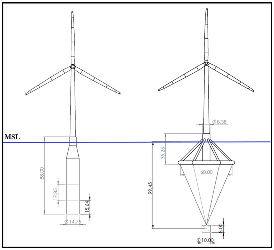 the weight of the system comprises the substructure, including steel and ballast material like water or concrete, and the turbine. Once the total weight is known, it is possible to estimate the submerged volume, knowing that is the sea water density is 1025 kg/m3 and g is the gravity acceleration, assumed 9.81 m/s2.