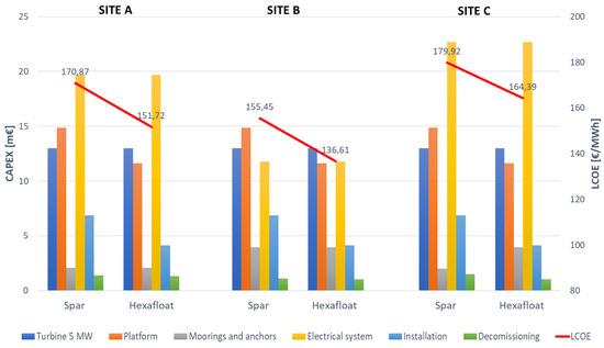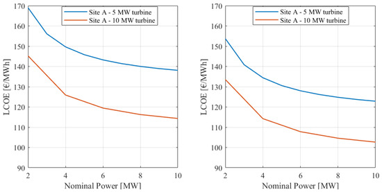 In Figure 21 it is observed that the curve of the LCOE for the larger turbine (10 MW) is always below the smaller one (5 MW). The use of larger turbines reduces the number of platforms, has a greater visual impact, and cannot be used for sites near the island.