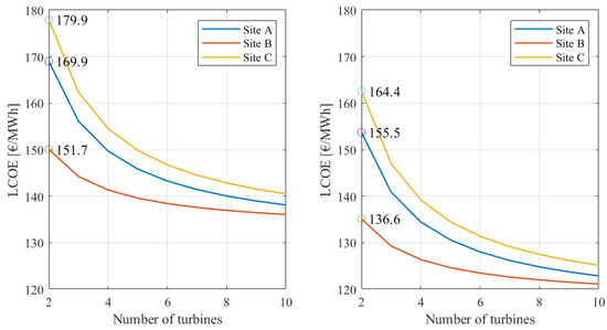 Influence of number of turbines for sites A, B, and C for both concepts.