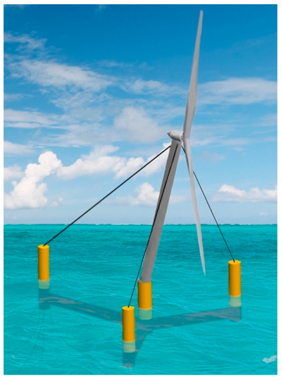 In this context, a new idea of a floating offshore wind turbine (FOWT) has been proposed. The conceptual idea consists of an arrangement with a central tower connected by pontoons to three columns by an angle of 120 degrees, as depicted in Figure 1. The columns are connected to the central tower by wires to reinforce the floating unit’s structural strength, allowing the tower and the other structures to be lighter. These wires, referred to as guy wires in this paper, add stability to the standing tower and can be connected to the center of the columns. Due to the light structural characteristic, the pontoons, columns, and tower are subjected to hydro-elastic effects due to a decrease in rigidity, which requires evaluating the forces and deformations due to the waves on the various structural elements.