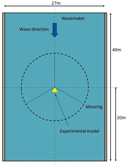 The experiments were conducted at the Ocean Engineering Basin in the National Maritime Institute (NMRI), Japan. The tank has dimensions of 27 m × 40 m × 0.93 m (width, length, depth) and is equipped with a piston-type wavemaker. The top view schematic of the setup is presented in Figure 5. The water depth was adjusted to be similar to the real conditions in the model scale, i.e., 55.8 m in the full scale representing a shallow water condition.