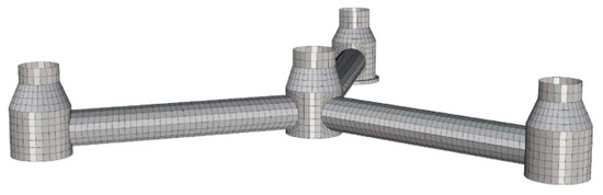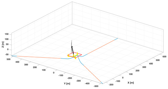 In the analysis code, the rotor and floating body were modeled as beam elements; the mooring system was modeled using the quasi-static catenary mooring method; however, the lumped mass method was also an alternative. For calculating the aerodynamic load acting on the rotor, the wind turbine analysis code, FAST [17], based on the blade element momentum theory developed by NREL (National Renewable Energy Laboratory), was used. A complete description of the method implemented in NK-UTWind can be found in [18]. See an example of the mesh in Figure 7.