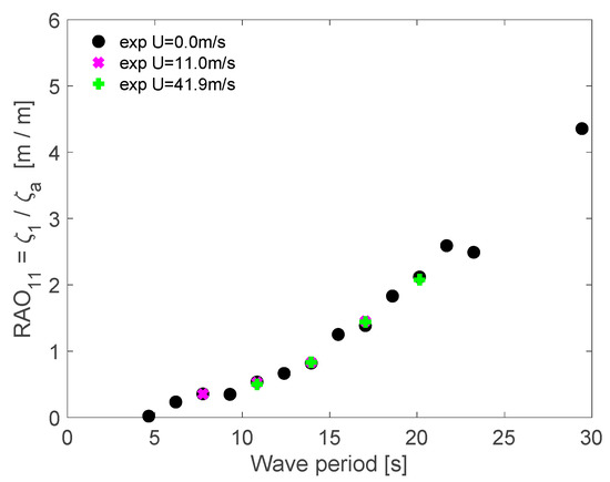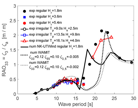 Figure 10 presents the RAO surge results. The experimental and numerical results agreed very well for short-period waves, s. Moreover, even for long-period waves, the comparison was good and showed the same qualitative behavior. Small differences could be observed around 22 s that represent the period of the pitch motion. The system presented a strong surge and pitch coupling due to the turret characteristic of the mooring lines. Numerical calculations using NK-UTWind code could observe the peak in the surge due to the pitch natural period, and the numerical results agreed well with the experiments. However, external damping in the cross-terms of the damping matrix should be added due to the coupling between the degrees of freedom in the WAMIT code calculations. The surge natural period was not visible in the RAO results because it is outside the range of periods calculated.