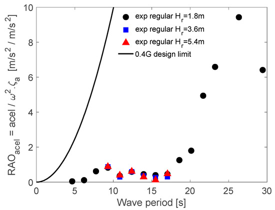 Figure 13 shows the experimental acceleration results at the rotor and nacelle assembly (RNA) calculated as an absolute acceleration value due to the six-dof motions. At the wave period of 25 s, acceleration at the tower top presented the most considerable value due to a peak in the pitch motion. The full line showed the 0.4 G design limit acceleration of RNA for comparison. It was possible to conclude that the absolute values of the accelerations observed during the model tests were lower than the design limit.