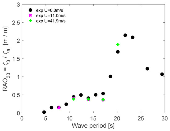 The RAO results obtained from the lowest height regular wave for surge, heave, and pitch and wind presence are presented in Figure 14, Figure 15 and Figure 16, respectively. Three conditions of incident wind speed were considered, as illustrated in Table 7, to verify the effects of the wind presence in the dynamic response in regular waves.