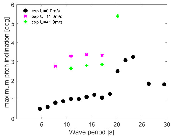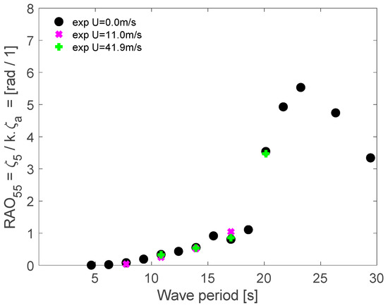 Figure 12 presents the RAO pitch results. All the experiment results suggested the same behavior. A clear significant peak was found around the pitch natural period. The pitch motion was also coupled with the surge motion; due to this behavior, the RAO pitch should have a peak value at the surge natural period around 36 s before reaching the unity value for long-wave periods. The experiments were performed until 30 s and could not confirm it.