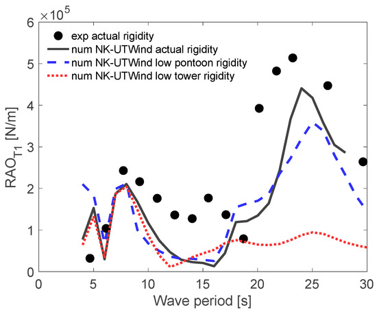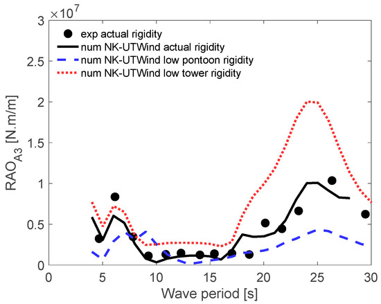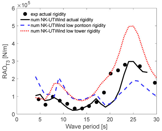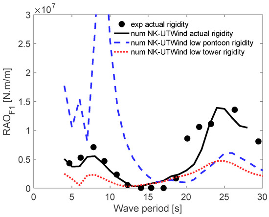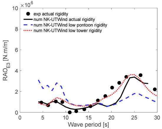 Overall, the effect of pontoon rigidity was large for wave periods between 7 and 8 s; moreover, the impact of tower column rigidity was significant for wave periods between 25 and 26 s.