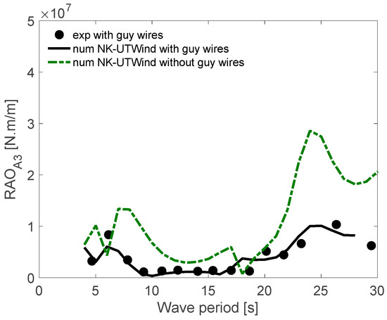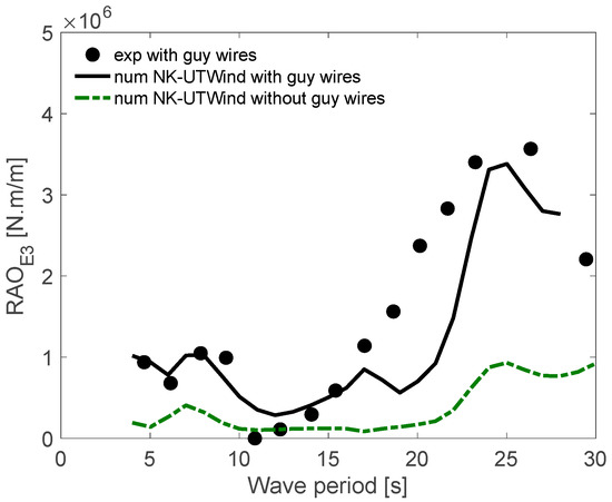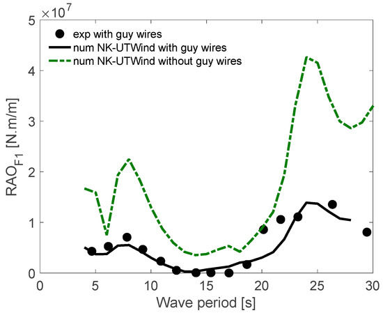 The influence of the existence or not of the guy wires was studied numerically using the NK-UTWind code. Figure 23, Figure 24 and Figure 25 present the effect of the guy wires presence on the RAO bending at the tower-base (F1), side pontoon (A3), and side pontoon (E3) gages, respectively.