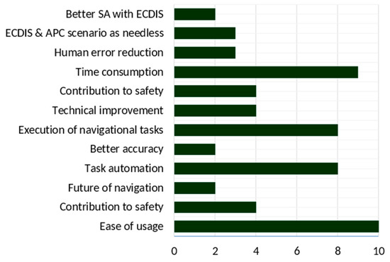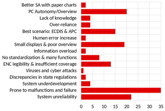 Counts (x-axis) of feature comments (y-axis) on advantages (lower image: system supporters) and drawbacks (upper image: traditional supporters) of ECDIS navigation compared with traditional means adopted and modified from [20].