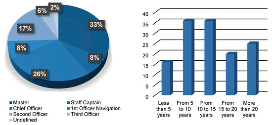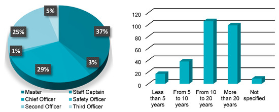 The ECDIS EHO survey (Figure 4) has included answers from 269 respondents: 100 masters, 8 staff captains, 77 chief officers, 4 safety officers, 67 second officers, and 13 third officers. As for their active working experience, 5 categories have been defined: (i) the 6% respondents have had less than 5 years of working experience, (ii) 14% have had 5 to 10 years of experience, (iii) 40% have had experience from 10 to 20 years, (iv) 40% of respondents have had from 10 to 20 years of working experience, and (v) 37% of respondents have had more than 20 years of working experience. The remaining 3% have not specified this answer.