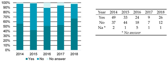 A first analysis has been made on the basis of the questionnaire submission year. The results in terms of three answering options (yes/no/no answer) have been plotted using a 100% stacked column chart (Figure 8). This allowed comparison of the percentage of contribution for each category, showing that the most significant share on the PNC removal was in 2018, equal to more than 65%.