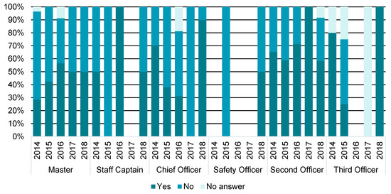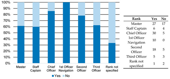 The general percentage of answers on Q2 HMI regarding the navigational rank is shown in Figure 10. The relative share of two possible answers (yes/no) has been provided by each participant’s rank. Approximately 60% of masters, staff captains, and third officers would like to withdraw PNCs from the service after the mandatory system implementation. The majority of the second officers (78%) and chief officers (86%), as well as all of the 1st officers navigation share the same opinion. The exception have been unspecified participants (2%).
