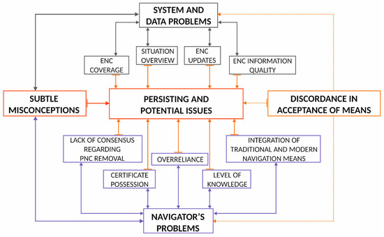 A combination of (i) (grey coloured arrows) and (ii) (blue coloured arrows) has been pointed out (red arrowed colour) as a most unwanted scenario, i.e., an operator with a low level of knowledge experiencing a system problem. As for discrepancies in the system acceptance, they could lead to intentional non-usage of the system and its features, nevertheless its role. This, unwanted chain of errors leading to potential hazards has been found, especially in this instant of time, to pose a serious threat to the navigation venture.