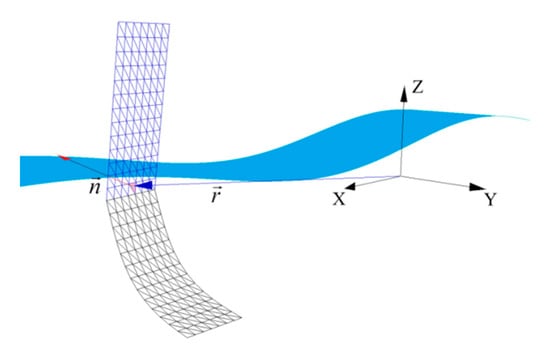 The local water elevation is expressed as a sum of harmonic wave components, according to the random phase model, as in Equation (15). A submergence test for each panel is then performed , taking into account its location relative to the encountered wave profile (e.g., []).