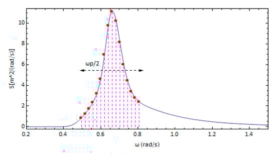 We have considered the tumblehome hull from the ONR topside series, with , and []. The hull was divided into zones, each of which was discretized using triangular panels of zone-specific panel sizing. The densest paneling was applied on a vertical zone extending equilaterally off the design waterline. The significant wave height and peak period were set at and , respectively, while 16 discrete components spanning a band of , centered at the peak frequency value , were considered (Figure 3). Selected results from simulations performed for the case of a JONSWAP spectrum can be seen in Figure 4, Figure 5 and Figure 6. The nominal speed was set at 12.0 m/s and the rudder gain values were , , while or was used. The instantaneous celerity curve is indicatively superimposed over the surge velocity curve.