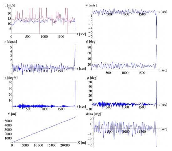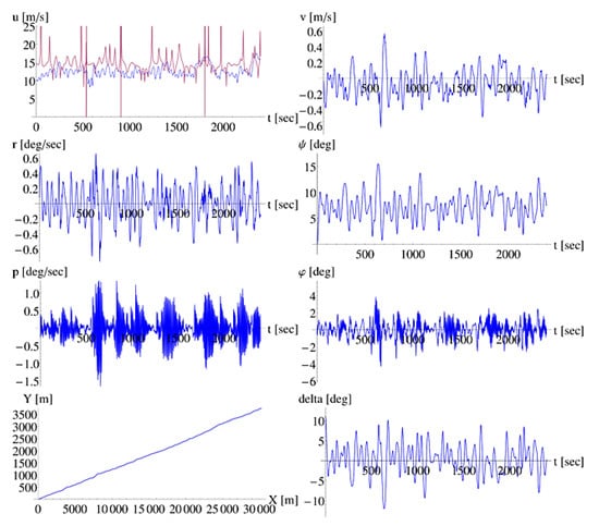 As already said, hull hydrodynamic reactions for sway and yaw were linearized. Thus, we should be able to capture only the tendency for deviating from the commanded course but not the accurate motion pattern. The horizontal hull maneuvering force (e.g., []), also inducing a rolling moment () (e.g., []), is then: