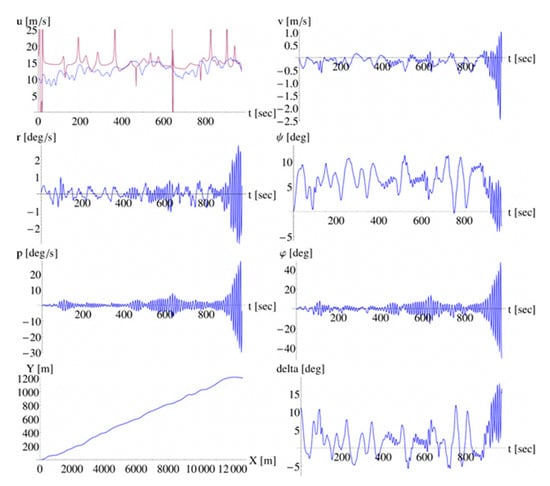 The presented time series in Figure 4 are derived from an “average” performed simulation, i.e., a simulation where the vessel sustained the hydrodynamic excitations and reacted with motions of smaller or larger magnitude, that were not, however, framed within a scenario of controllability loss. Such an event, in fact a broaching-to event, is presented in Figure 5, where at around 2000 s the ship suffers from a yaw and roll motion of severe magnitude. Another interesting case is presented in Figure 6, where the vessel attains parametric type responses with significant coupled sway–yaw–roll oscillations that exceed our defined thresholds of capsize criteria.