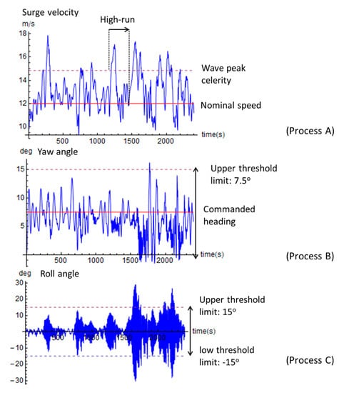 Definitions of the three processes which set up the ship motion exceedance problem. The upper graph shows the surge process and the associated thresholds (Process A). Similarly, for Process B (yaw angle) in the middle graph, and for Process C (roll angle) in the lower graph.
