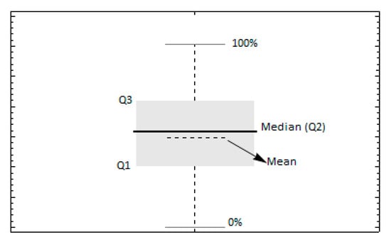 The sea state is represented by a JONSWAP spectrum, considering however only a frequency band around the spectrum’s peak period, in order to introduce a “narrow-band” condition. Table 1 presents the values of the parameters that define what will be called “the main scenario” of the present investigation. For the presentation of the key statistical information, as derived by the 500 realizations per scenario, we select the whisker-box type of diagram. This is a convenient type of graph in descriptive statistics for the graphical comparison of distributions, based mainly on their quartiles. Specifically, according to Figure 8, the lower line of the box corresponds to the 1st quartile (or the 25th percentile), while the upper line of the box corresponds to the 3rd quartile (or the 75th percentile). Furthermore, the median is also included in the graph, whereas in the following graphs we have also included the mean value.