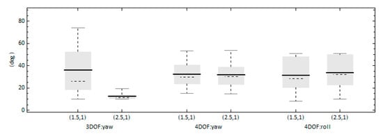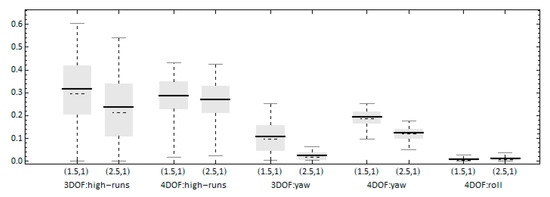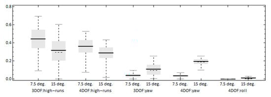 As in the case where a 3DOF model was used [], it is expected that the commanded heading will significantly affect both the occurrence of high-run and yaw-exceedance events. Figure 8 presents the time-ratios of these processes for the two models for the two examined commanded headings. Concerning the high-run time-ratio, the difference between the two models is more pronounced for the 7.5° heading scenario, where the 4DOF model presents a lower tendency for high-runs. Furthermore, the expected decrease when the heading is increased is more pronounced for the 3DOF model. On the other hand, the 4DOF model presents a higher ratio of exceedance of the yaw angle threshold for the 15° heading than those of the 3DOF, while the results are comparable for the 2 models when the heading is 7.5°. In addition, Figure 9 includes the time-ratio of exceedance of the roll threshold, where a slight increase occurs for the higher heading scenario.