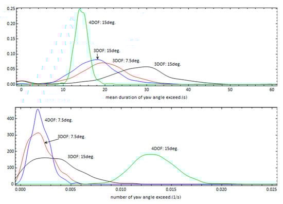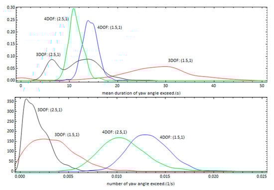Probability density functions of the mean duration of yaw exceedance (upper graph) and number of exceedances per unit time (lower graph) for different commanded headings using the 3DOF and 4DOF models.