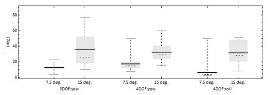 We further examine the difference in the occurrence of yaw exceedance between the 2 models by calculating the frequency and duration of these events (Figure 10). For the 15° heading, the yaw exceedances of the 4DOF model occur much more frequently but with lower mean duration compared with the respective ones of the 3DOF model. One more difference between the 2 models is that for the 4DOF model the exceedance duration is larger for the 7.5° heading. The longer exceedance durations observed in the 3DOF seem to result with higher yaw angles achieved, as Figure 11 shows. The yaw and roll angles are significantly increased for the higher heading scenario (15°). However, while the mean yaw angle values between the 3DOF and 4DOF models are comparable, the 3DOF model resulted in higher values for the higher percentiles. For example, the 3rd quartile values are 77 deg. and 60 deg. for the 3DOF and 4DOF models, respectively. Therefore, the addition of the rolling motion seems to decrease the yaw exceedance duration and the amplitude of the yaw response, but increase the frequency of threshold exceedances.