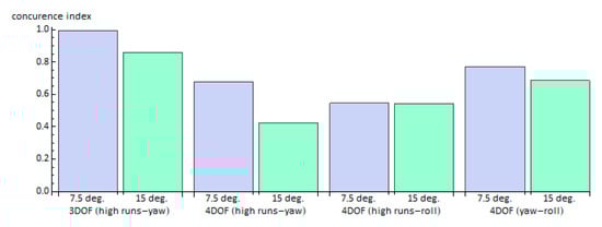 One of our main aims in this study is to examine whether the examined processes are correlated with each other. Specifically, by utilizing the concurrence index as defined previously, we aim at quantifying the ratio of the roll exceedances that occur during significant yaw deviations or during high-runs. Additionally, we examine whether yaw deviations from the commanded heading are related with high-runs occurrences. Such an analysis was carried out also for the 3DOF model as shown in Figure 12, where high concurrence of yaw exceedances and high-run events had been found out for both headings.