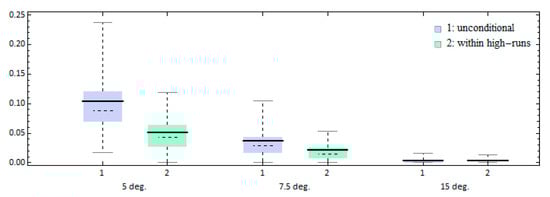 The identification of high-runs is carried out by utilizing the velocity crossing method that was described in Section 2. Specifically, we select as the up-crossing velocity the wave celerity that corresponds to the peak frequency of the wave spectrum, while ship’s nominal speed is chosen as the down-crossing velocity threshold. These velocity limits were also utilized in [].