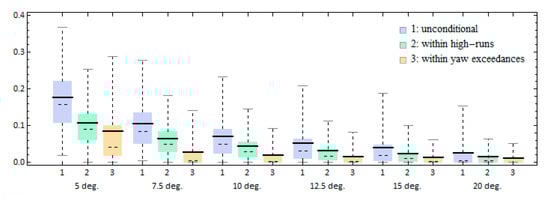 For the time-ratio calculation, we targeted two types of yaw angle exceedance: in the first, events are counted on the condition that they occur when a high-run is in progress. In the second all exceedances are counted irrespectively of whether they coincide with a high-run incident. We call the first a “conditional” broaching-to scenario and the second an “unconditional” one.