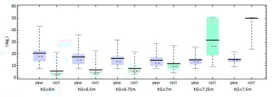 The assumed value of the vertical position of the center of gravity, KG, is expected to affect the roll statistics. Figure 18 presents the results for the maximum yaw and roll angle achieved for a range of KG values. For the roll angles, there is a steady increasing trend as the vessel’s KG was increased while the maximum yaw angle did not show sensitivity. Notably, for KG = 7.5 m the mean value of maximum roll angles (from all realizations) was approximately 50°. It means that capsize due to the exceedance of the critical roll angle threshold occurred in almost every realization. It shall be remembered that loss events are characterized as events where, either capsize due to exceedance of the threshold limit of roll angle (50°), or “hard” broaching-to due to yaw angle exceedance of 90° from the commanded heading has occurred. For the examined scenario of 7.5° commanded heading, all loss events were owed to excessive roll.