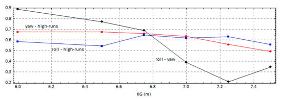 Regarding the effect on the concurrence index, according to Figure 19, the occurrences of roll exceedance for the larger values of KG are, in their majority, not strongly correlated with significant yaw motion (less than 40%). This trend is reversed for the lower values of KG, where roll exceedance occurs in most cases within yaw exceedances (above 80%). On the other hand, the concurrence with high-run appears to not be greatly affected by KG, as indices of 55–65% were estimated in the examined KG range. Moreover, the concurrence index of yaw exceedance and high-run is slightly better for the lower KG values (about 70%) and decreases for the higher ones.